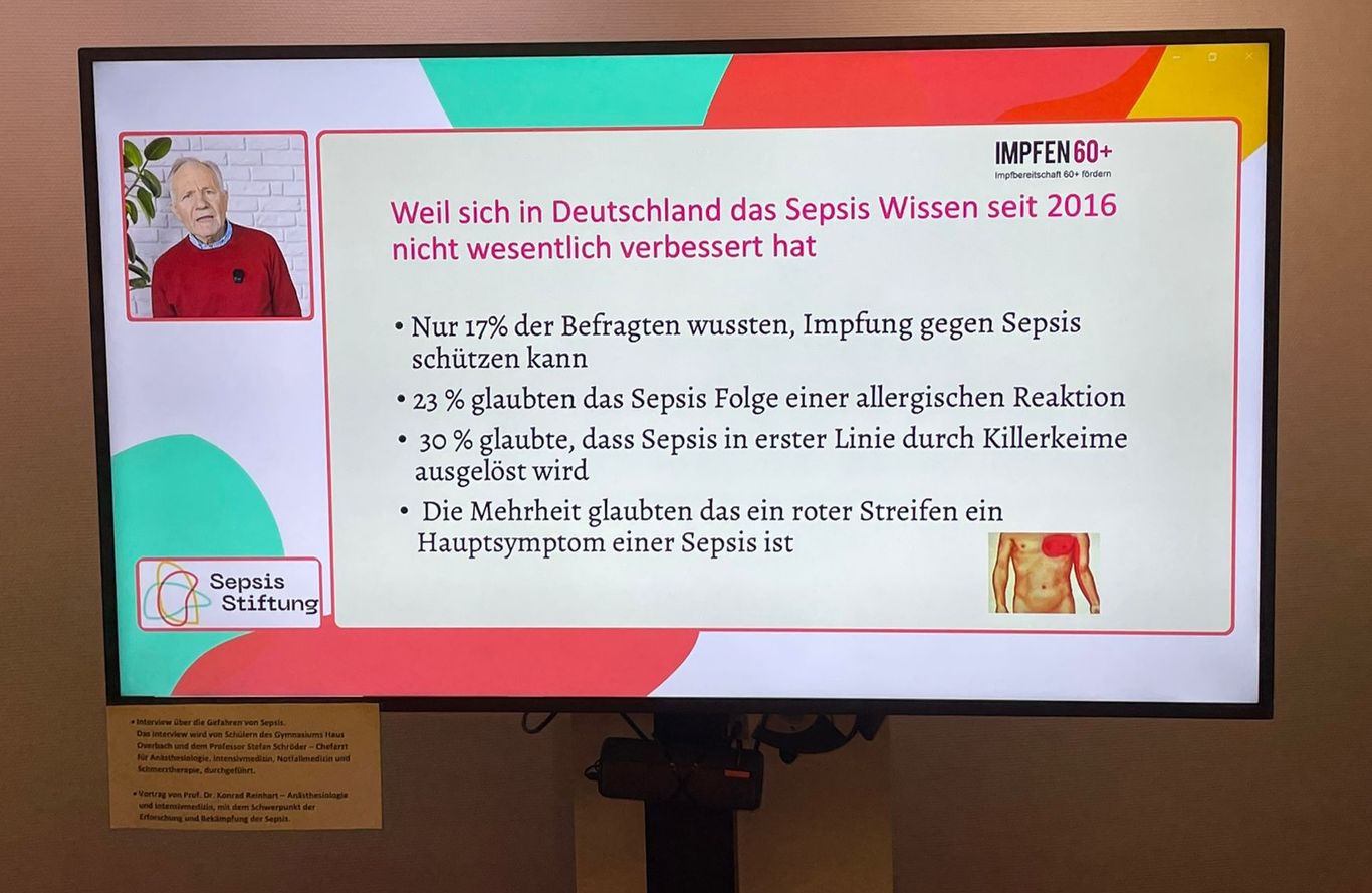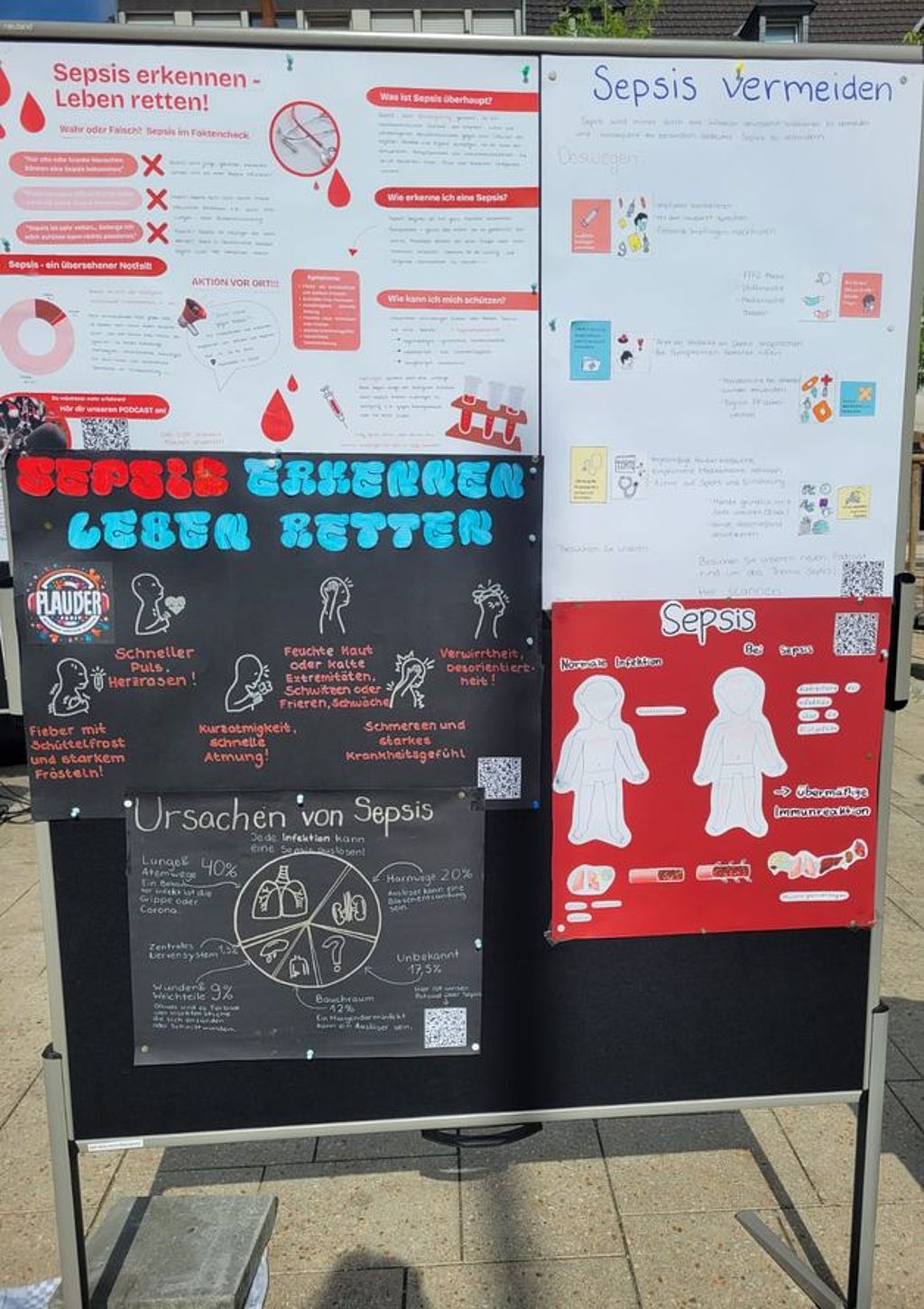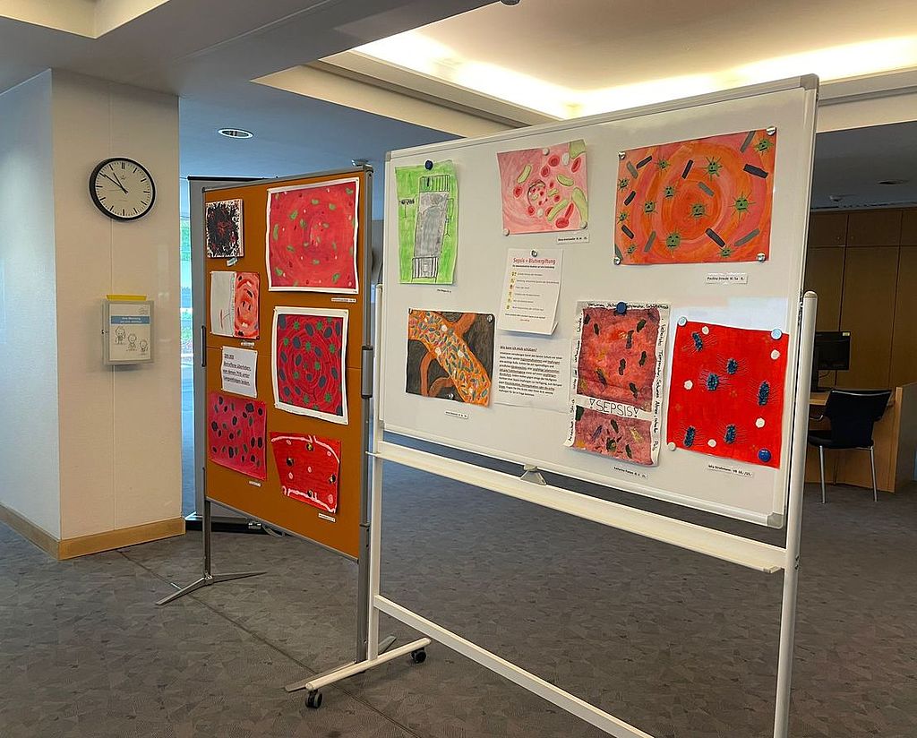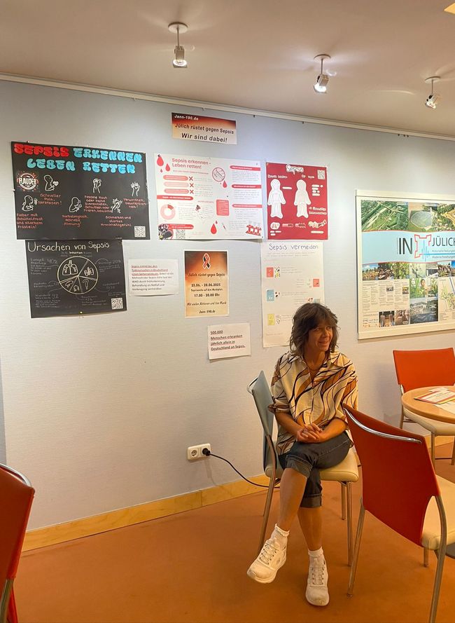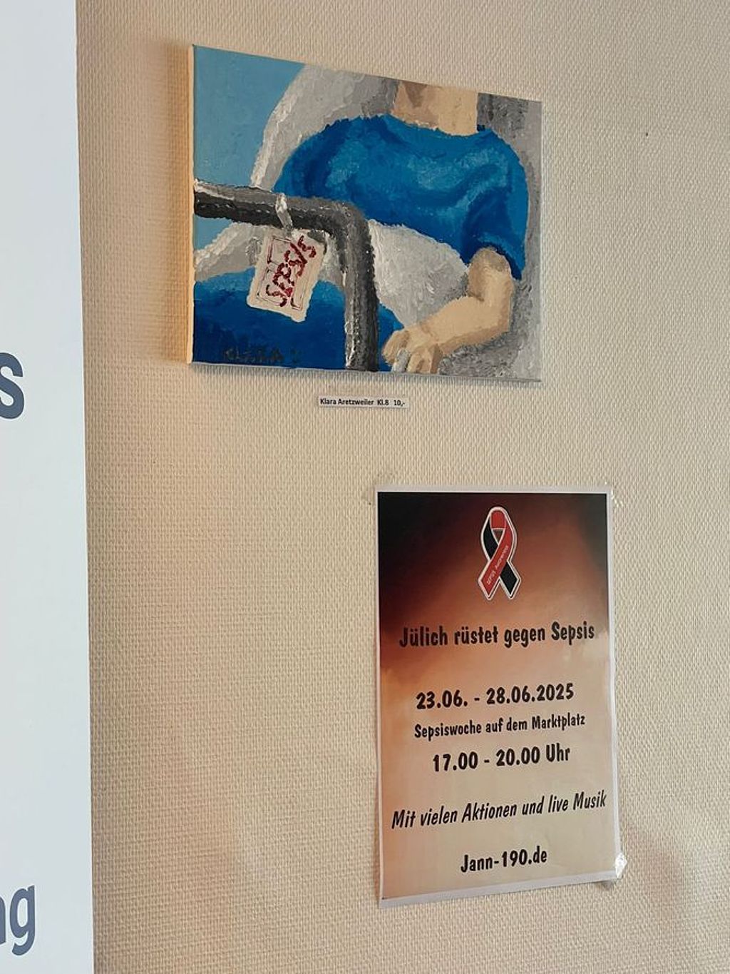 Vom 16. - 29.07.2025 fand im Krankenhaus Jülich eine Ausstellung zum Thema Sepsis statt. Hier wurde ein Interview von Schülern des Gymnasiums Haus Overbach mit Prof. Schröder geführt, ein Vortrag von Prof. Reinhart gezeigt sowie selbst gestaltete Bilder zum Thema Sepsis von Schülern des Gymnasiums Haus Overbach und Infoplakate des Mädchengymnasiums und entsprechende Broschüren ausgestellt.